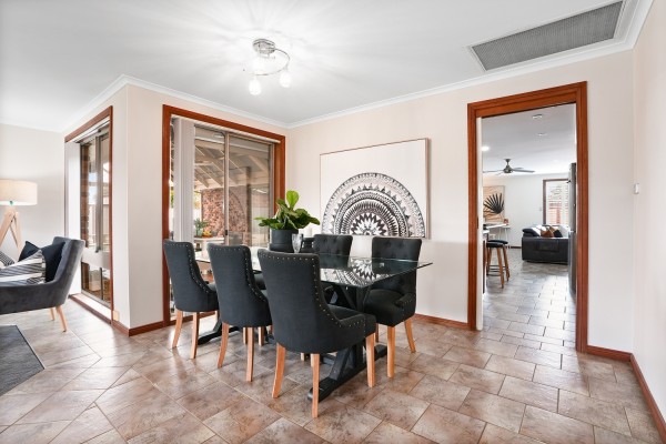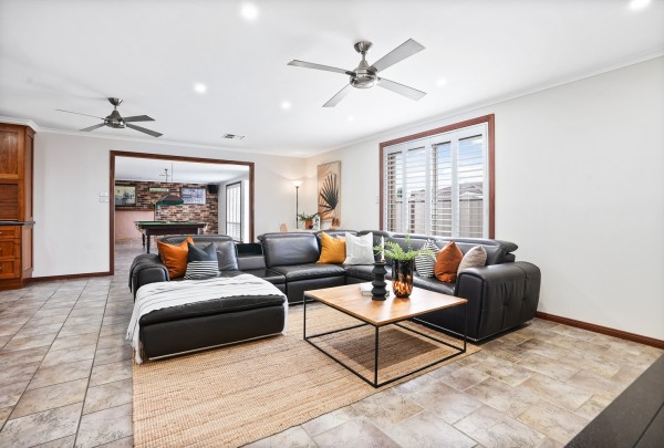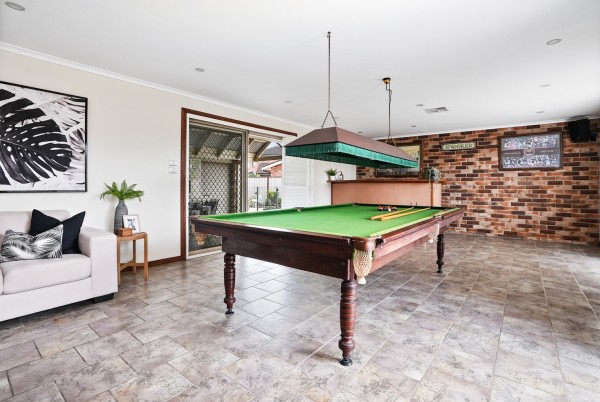 THE LIVING SPACE: Spacious lounge and dining areas at the front of the property. There is also a living room and huge rumpus room at the rear off the property. These 2 living spaces include downlights and plantation shutters throughout, plus a bar area and a pool table in the rumpus room.