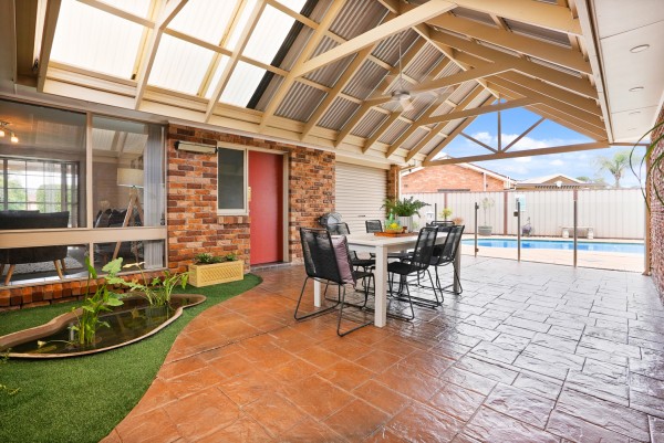 OUTDOORS: Spacious gable roof entertaining area with an outdoor ceiling fan and a fish pond, overlooking the sparkling in ground pool- perfect for entertaining guests