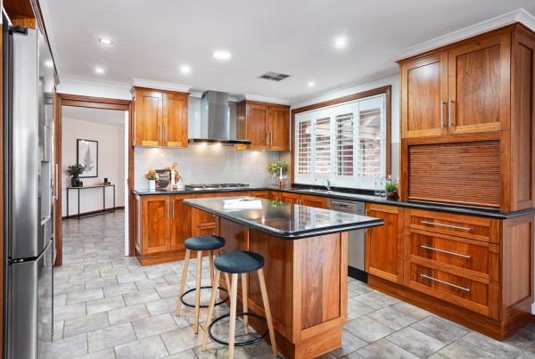 THE KITCHEN: Beautifully presented timber kitchen offering an island bench with breakfast bar potential. There is also a gas cooktop, dishwasher and plenty of cupboard space for storage.