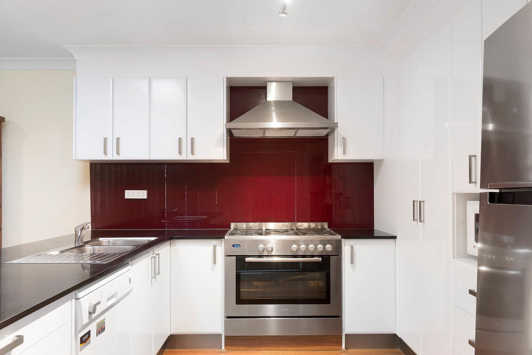 Tastefully renovated polyeurathane kitchen with freestanding gas stove, dishwasher, granite benchtops, glass splashback and offers an abundance of bench and cupboard space