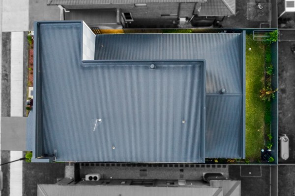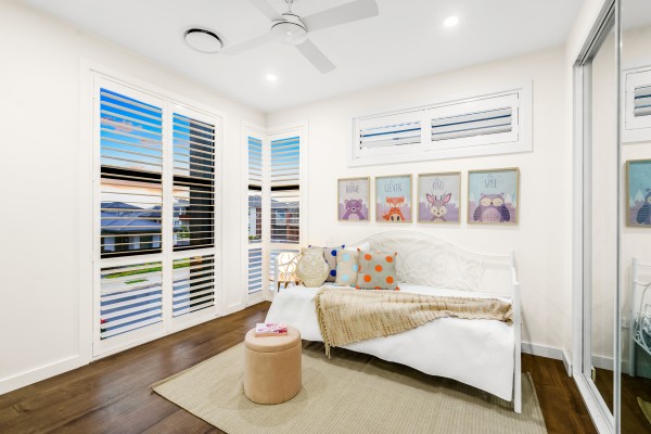 High corner windows to the front of the house at both levels with plantation shutter blinds.