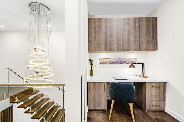Mono stringer staircase landing into the Spacious rumpus upstairs.