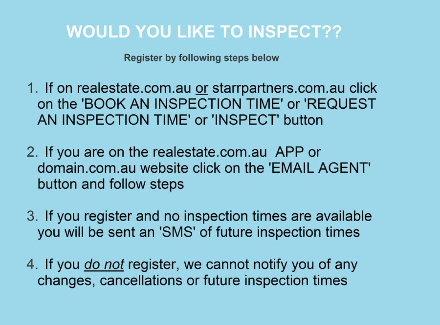 1. If on realestate.com.au or starrpartners.com.auclick on the `BOOK AN INSPECTION TIME or REQUEST AN INSPECTION TIME or INSPECT 'button